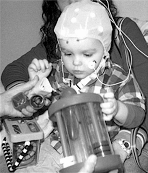 之前有研究表明,当一个典型的、正在发育中的20个月大的孩子听到一个新词时,其左侧大脑半球的脑电波会出现一种独特的上升,这种现象可以通过脑电图(EEG)探测到——EEG是一种非侵入式探测大脑电波活动的方法。Kuhl将24名患有ASD的2岁大幼儿请进了她的实验室。通过给孩子们带上连接了传感器的尼龙帽,研究人员监控了每个孩子的大脑活动,她和她的团队要求每个孩子的父母说出他们孩子所熟悉的单词,并将一些陌生单词如“品脱”或“指南”等夹杂着列入到测试他们的单词表中。