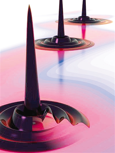 以上效果图显示了显微镜下超快红色激光脉冲在砷化镓半导体上激起的“量子液滴”。每滴“液滴”中的电子和空穴以液态模式环状排列,其周围则是等离子体。美国天体物理联合研究实验室供图