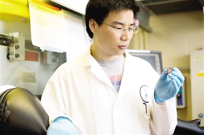 宁志军博士展示喷涂了胶体量子点的薄膜实验样品。