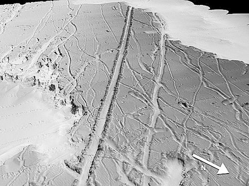 而这些被奔流的洪水驱动的冰川(一些能达数百米厚),能沿着大陆架像犁一样穿过海底的海槽。正如研究人员在南卡罗来纳州离岸水域170米~380米水下发现的那些痕迹,其中一条狭窄水道从图片左下方延伸到中上部。