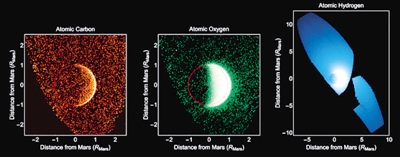 MAVEN紫外光谱成像仪拍摄的火星大气中的碳、氧和氢元素图像。