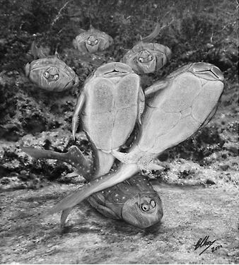 直到几年前,盾皮鱼还被视为一个“单源”的种群——包括所有后代的进化“死胡同”。然而最近,包括英国伦敦帝国理工学院古脊椎动物学家Martin Brazeau在内的研究人员认为,基于其颅骨结构,盾皮鱼可能并不是一个单源种群。这意味着与其说人类与盾皮鱼共同拥有一个祖先,不如说盾皮鱼本身就是人类的祖先。