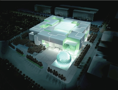 整个建筑共投资11.145亿元,包括地下一层、地上四层、局部五层。建筑立面的正面采用连续的白色波形金属板,侧面是绿色反光玻璃和不锈钢板的组合,随着季节转换和一天中日光的变换及晚间的灯光效果,呈现明暗变幻的动态景象。
