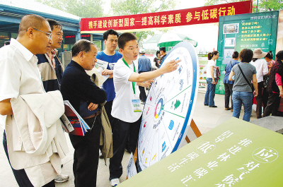 在北京紫竹院公园为主场的北京科技周活动中,工作人员在向市民讲解《碳足迹计算器》使用方法。本报记者董志翔摄