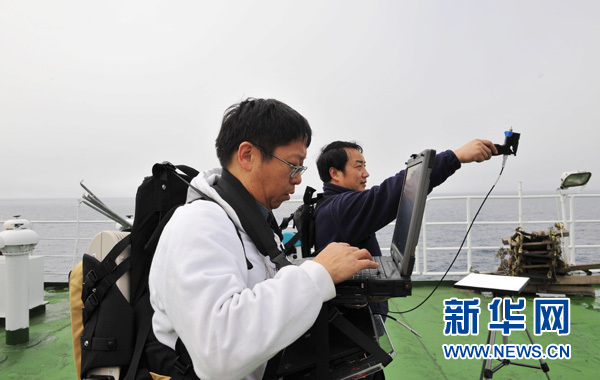 7月12日,美国得克萨斯大学的谢红接(前)和南京大学的柯长青(后)在“雪龙”号上用光谱仪测量太阳辐射。当日,我国第四次北极科学考察队乘坐的“雪龙”号极地科学考察船在白令海进行海洋综合调查。新华社记者 张建松 摄