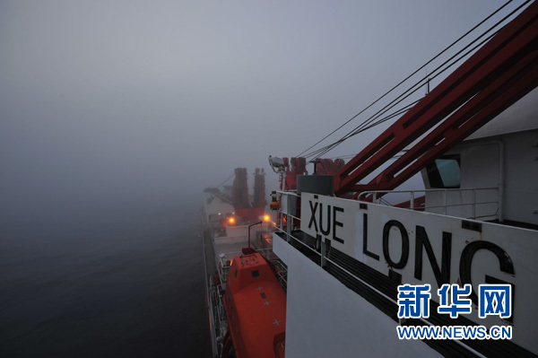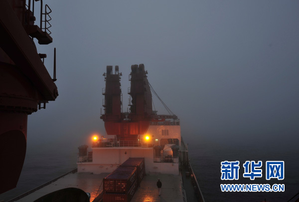 7月13日,“雪龙”号在白令海遭遇大雾。当日,我国第四次北极科学考察队正在白令海进行海洋综合调查,大雾给考察队员们的海洋观测和采样工作带来一定困难。白令海是世界上第三大边缘海,其海底东部是宽广的大陆架,西部是4000多米的深水海盆。我国考察队员的海洋调查站位于深水海盆。新华社记者 张建松 摄