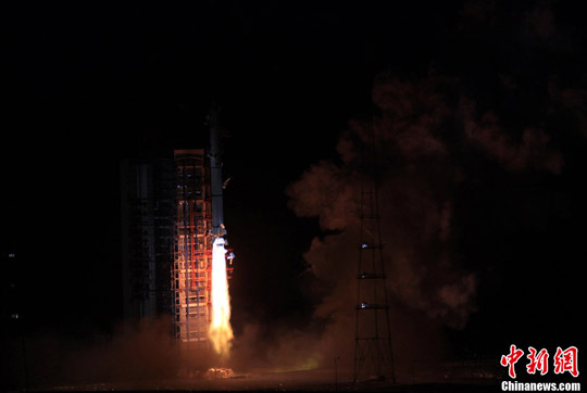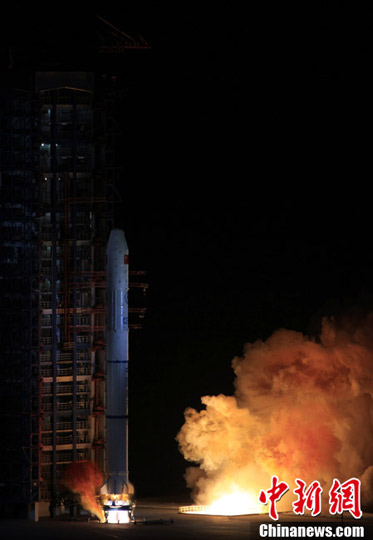 北京时间11月19日清晨6时53分,古烽火台下的中国太原卫星发射中心发射场,“长征二号丙”运载火箭顺利点火腾空,以一箭三星方式,将“环境一号”C卫星送入预定轨道,并成功搭载发射了一颗新技术验证卫星和蜂鸟试验载荷。中新社发 孙自法 摄