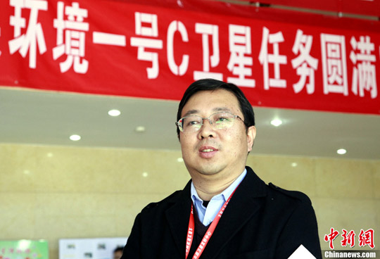 图为发射前夕,中国空间技术研究院研究员、“环境一号”C卫星总设计师张润宁向媒体介绍卫星研制情况。中新社发 孙自法摄