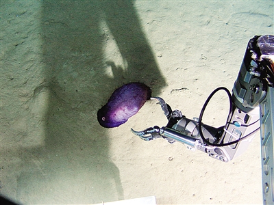 “蛟龙”号在海底抓取紫色海参。蛟龙摄