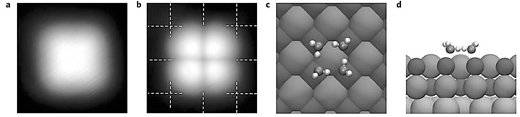 图a—d为水团簇在盐表面上的氢键构型(图a、b为显微镜下的图像,图c、d为不同视角的理论模拟结构图)。