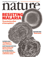 被称为“血红蛋白-C”的突变长期被认为是疟疾所选择的突变,直到最近才在实地研究中发现,在西非,该突变实际上可保护儿童免受疟疾感染。现在,研究人员已经搞清了这种保护作用的一个机制。在含有正常“血红蛋白-A”的红血球中,疟原虫能产生由黏附蛋白(PfEMP-1)构成的分布均匀的表面突起,使得被感染的细胞能够附着到血管壁上,避免被脾脏破坏。“血红蛋白-C”能造成这种突起分布异常,减少PfEMP-1的显示度,从而影响被感染细胞向血管壁的附着。本期封面所示为一个两面凹陷的未被感染的红血球、一个被感染的正常红血球上的典型的突起和一个含有“血红蛋白-C”的被感染红血球上的异常突起。