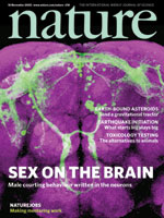 果蝇的“无果实”基因首次被发现是因为突变的雄性表现出同性恋行为。它的基因产物在雄性和雌性之间有所不同,存在于整个中枢神经系统的各组神经元中,但没有发现明显的神经解剖差别。现在,研究人员在果蝇大脑中发现了雄性和雌性有所不同的表达“无果实”基因的一组神经元。这种差别是由主动除去雌性的神经前体细胞产生的。雄性特有的Fru蛋白抑制这种细胞程序死亡,使它们能形成一个神经回路,这个回路引导它们去追求雌性,而不是雄性。这个发现说明了一个特定的基因何以能够引导大脑发育以及随后的与性别有关的行为。在这个例子中,我们可以结合一个已经被发现的神经回路和“性别决定基因”的已经被确定的作用来理解性取向。本期封面所示为这一关键大脑区域中的神经元。