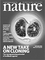 本期Nature上一篇论文纠正了克隆领域一个长期存在的误解。自从上个世纪80年代初所作的第一批核转移实验以来,人们普遍认为,成功的动物克隆和胚胎干细胞系生成需要将体细胞核转移进一个受精的减数分裂卵母细胞中。现在,Egli等人通过利用小鼠细胞所作的一系列实验证明,重新编程活动在受精之后还在合子(受精卵)中继续进行。这一发现对于我们了解核重新编程和克隆动物的生物学具有重要意义。他们的实验结果还表明,科学研究中实际上可以不用让妇女捐献卵母细胞,因为那些进行人工授精的诊所放弃的受精卵或胚胎卵裂球也许就可以作为合适的接受细胞来生成定制的人类胚胎干细胞系。本期封面所示为染色体向受精卵中的转移,是在染色体转移后所发生的第一次有丝分裂之后的情形。