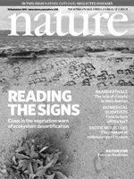 干旱生态系统占地球土地面积的约40%,是20多亿人生活的家园,但它们在气候变化和人类行动面前仍然很脆弱。Kéfi等人利用数值模型及来自西班牙、摩洛哥和希腊的地中海生态系统的数据发现,植被斑块大小分布遵从一个“幂次法则”。随着动物吃草对植被造成的压力的增大,斑块大小分布将偏离该“幂次法则”,接近向荒漠条件过渡的状态。所以,斑块大小分布可能是荒漠化的一个有用的预警。本期封面所示为西班牙Belchite的El Planerón自然保护区的一个干旱景观(在封面照片的上部),下部所示为这一景观退化的情况。在另一篇论文中,Scanlon等人用卫星影像表明,卡拉哈里盆地的树丛大小分布也遵从一个无标度“幂次法则”。这种现象可以用与现有树木附近的有利环境相关的正反馈来解释。在一篇News&Views文章中,Ricard Solé对这两篇论文都进行了讨论。