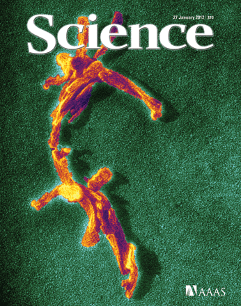 一个日本的研究团队报告说,跳蛛有着一种帮助他们扑向其猎物的不同寻常的感知深度的系统。大多数的动物或是通过调节其眼中的晶状体的焦距(如人类那样),或是移动其头部以制造一种叫做运动视差的效果来评估与某个物体的距离。新的发现提示,跳蛛用的是一个叫做图像散焦的第三种选择,该方法涉及到将一个模糊的画面与一个清晰分明的画面进行比较。人类用画面散焦来对两个物体间的距离进行粗略估计——想想那些前景模糊但背景清楚的照片——但是到目前为止,没有一种已知的动物是用画面散焦来确定与某单个物体的距离的。Takashi Nagata及其同事的这些发现是通过分析跳蛛原发眼的四层视网膜中的每一层而做出的。说来奇怪,这些视网膜中有一层内含有一种绿敏色素,尽管事实上这一层视网膜不会聚焦绿光。因此,在正常的“白色”日光中,这一层总是会接收一种未聚焦的图像,而其他各层则会接收聚焦的图像。文章的作者估计,这一差别可允许该种蜘蛛通过画面散焦来估测某个物体的深度。让蜘蛛接触彩色的光线证实了这一假说,因为在绿光中的蜘蛛会做出精准的跳跃,但处在红光(在红光中,所有较短波长的光线,其中包括绿光都缺乏)中的蜘蛛几乎总是跳到还不到它们目标的地方。一则相关的《观点栏目》讨论了这一研究。