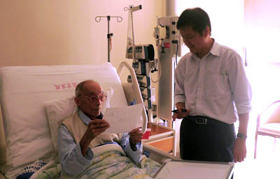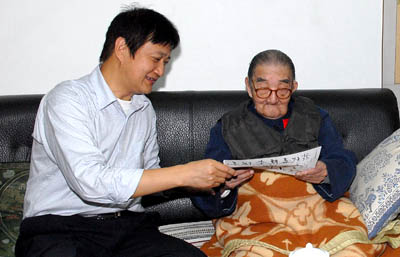 李静海与贝时璋亲切交谈 在贝时璋院士家,李静海向贝老致以亲切的慰问和节日的祝贺,感谢他长期以来为祖国科技事业和中国科学院的建设和发展做出的重要贡献,并邀请贝老方便的时候观看建院60周年成就展;同时,在贝老106岁生日来临之际,李静海预祝他生日快乐、身体安康。贝老也对中国科学院60年来取得的成就表示祝贺,对院党组的关心表示感谢,同时希望中国科学院的未来有更好的发展。 中国科学院办公厅副主任廖方宇、生物物理所党委书记杨星科、力学所党委书记周德进以及中科院院士工作局等部门的同志陪同看望。 |