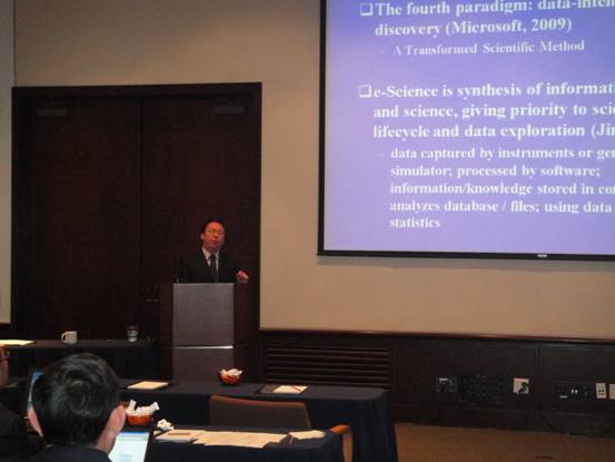 谭铁牛作了题为“基于先进科研信息化基础设施的中国科学院科研数据应用”的主题报告。报告中,谭铁牛副秘书长阐述了科学研究及工程研究面临科研数据日益爆炸局面,数据密集型的科学发现已经成为科研信息化一种重要模式,中国已经开始了科学数据共享平台及国家科技基础条件平台建设。他介绍了中科院先进科研信息化基础设施情况,包括互联网络环境、超算应用环境、数据应用环境等,支持科研数据的采集、传输、存储、处理、应用全生命周期。他强调,中科院科研信息化基础设施愿景目标是建立一个开放科学云,不仅服务于本院科研人员,而且服务于更广泛的科研社区用户。他表示,中美作为最大的发展中国家和发达国家应充分加强在科学数据方面的交流与合作。
