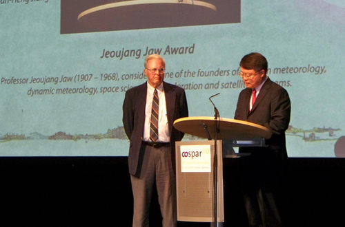 自2008年起,中国科学院与COSPAR联合设立了以我国人造卫星奠基人之一,著名空间科学家赵九章先生命名的 “赵九章奖”, 授予在促进空间研究方面以及建立新的空间科学研究和探测项目方面具有卓越开创性贡献的科学家。此次赵九章奖获奖者美国马萨诸塞大学Calvin T. Swift 教授长期从事对地观测领域特别是微波遥感领域的研究工作,具有很高的国际知名度。1983年以来,在他的领导和主持下,研制开发出世界上第一台用于对地观测的干涉式综合孔径微波辐射计(ESTAR),并建立了相应的理论基础。这一开创性的工作已经引发了全球各空间国家在该领域的迅速发展,形成了新一代的微波辐射成像技术,并已经逐渐成为卫星计划,为对地观测和空间探测提供大量新的数据,推动了应用的发展。