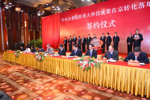 10月26日,“中央企业院校重大科技成果在京转化落地项目签约仪式”在京举行。中共中央政治局委员、北京市委书记刘淇,北京市委副书记、市长郭金龙,中科院副院长丁仲礼,中国航天科技集团公司党组书记、总经理马兴瑞,北京市委常委、常务副市长吉林,副市长苟仲文等领导出席签约仪式。仪式由北京市委常委赵凤桐主持。