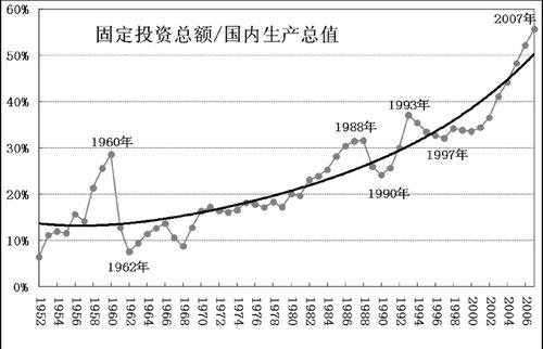 在这样的背景下,这些聚敛起来的财富统统需要进行投资以追逐利润。以前,学界将投资饥渴归之为计划经济的顽症。事实证明,在“主流”经济中,投资饥渴远超过“接轨”前。就在提出“穷人经济学”的这几年,投资总额/国内生产总值的飙升速度远超出任何历史时期,在2007年,国民创造财富的55.65%转化为固定资产投资,追逐着未来的利润(见图十二)。这个比值的平衡位置显示出持续的加速上升态势。