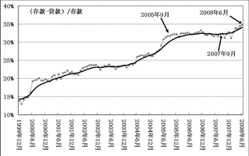 同时,广大中小企业却融资无门,只好靠自我积累,在资金链紧张时,就难免落入高利贷的陷阱。与此同时,银行系统却面对着持续上升的存差(见图十一)。从央行的月度数据看,存差总的趋势是扩大,即使在投资过热的2005年9月至2007年9月,存差也维持在32%左右,不见下行;本轮宏观调控后,经济降温,存差又重回上升轨道,到2008年6月已创历史最高纪录,接近35%。