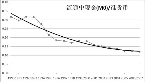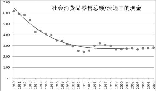 购买消费品并为逐利资金提供利润,靠的是流通中的现金。图七展示出社会消费品零售总额与流通中的现金的比值。数据显示:1980年这一比值为6.18,即一单位的现金存量在一年内对应于6.18单位的社会消费品购买。转轨过程中,这一比例持续下降,到1991年下降到3以下,此后8年经过一次接近正弦波的波动,于1999年起稳定在2.68到2.82之间。这表明消费与货币间的关系已经完成“转型”。
