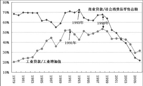历史数据表明,1993年以前,商业贷款/社会商品零售总额在60%到70%左右波动,而1993年以后,这项比例开始系统性下滑,1998年以后更是逐年高速下滑。至于工业贷款/工业增加值,1991年以前呈增长趋势,1991年至1998年在50%左右波动,1998年后系统性下降。