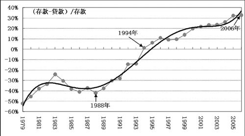 银行系统的作用在于将储蓄转化为投资,“转轨”之前,我国的存款不敷投资之用,“投资饥渴”是当时学者们讨论的热点问题,表现在银行系统就是大比例的贷差。“转轨”让这一比例持续下降,并于1994年发生逆转。此后存差持续扩大。到2006年存差已达存款的1/3(见图五)。