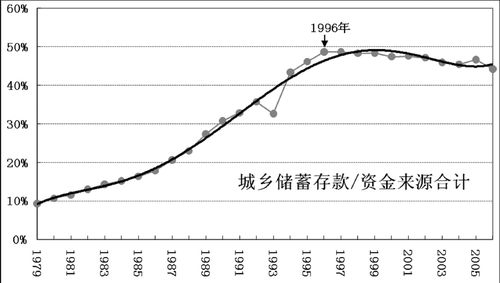 “转轨”之前,金融资产主要集中在政府与国有企业手中,“转轨”过程中城乡居民存款在金融系统信贷资金来源中的比重持续上升,到1996年后升势停止,这个比重大体稳定下来。这表明,1996年后一个明显的转变过程结束(见图四)。