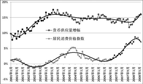 观察图二的两条曲线,看不出货币供应量增幅变化能及时影响居民消费价格指数升降。如果硬要寻找两者间的因果关系,比较可能的是2006年9月到2008年2月的居民消费价格指数上升与2001年2月到2003年6月的货币供应量增幅上升相对应。如果这一对应成立,宏观调控的效果应有4~5年的时滞。换而言之,2006年9月以后的通胀是4~5年前货币发行加速的结果,而目前的通胀趋缓,则是2003年9月之后紧缩货币的结果,由此后的货币供应量增幅数据可以估计,今后的通胀率只能缓慢下行。而且由于2007年10月到2008年6月货币供应量增幅的抬升,4~5年后还可能发生一次通胀危机。