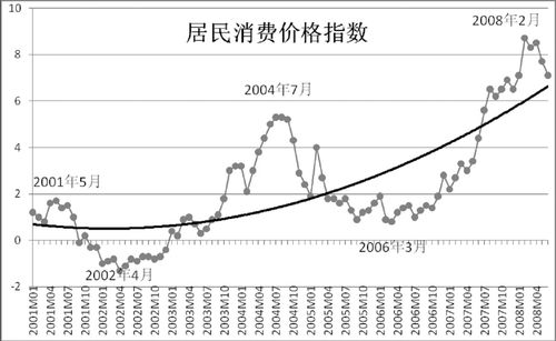 国家统计局网站提供的逐月居民消费价格指数自2001年1月开始(见图一),数据显示,我国居民消费价格指数呈明显的波动,相邻波峰之间、波谷之间的周期将近4年——这正是经济学家们讲的“基钦周期”。基钦观察美国和英国1890年到1922年的利率、物价、生产和就业等统计资料,发现其存在周期为40个月的波动。他用生产过多形成存货——从而导致生产下降——进而导致存货减少——于是生产再次扩张来解释这种现象。然而图一的数据却显示出,波动的平衡位置在加速上升。显示出可能发生通胀的态势。