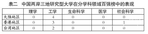 中国两岸三地的若干名牌大学经过这些年的快速发展,已开始在世界高等教育舞台崭露头角。在工科方面已经具有较强的国际竞争力,大陆地区、香港地区和台湾地区分别有4所、3所和2所研究型大学在工学方面进入世界百强行列。理科也呈现出较强的发展潜力,若干所大学的各项学术指标已接近世界百强的水平。生命科学方面虽然与世界一流大学相比还有较大差距,但是发展势头十分迅猛。因此,在可预见的时期内,两岸三地的研究型大学在工学、理学和生命科学这3个学科领域较为容易实现突破,形成国际竞争力。