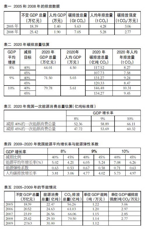 我国政府作出到2020年单位GDP的CO2排放量比2005年降低40%~45%的承诺。根据我们的理解,对这个承诺首先需要明确两点:一是此排放特指化石能源利用和水泥生产的排放,不包括土地利用的排放,亦不包括生态建设的(固碳)负排放;二是GDP计量必须是2005年的不变价格,不能是名义GDP(即要排除通胀因素),并只能以人民币为单位,不能以美元计(即要排除汇率变动因素)。在这样的前提下,我们即可计算出2020年我国总共可以排放多少CO2。