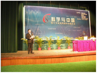 沈保根副秘书长介绍"科学与中国"院士专家巡讲团活动的背景和意义。 12月16日下午,在广东省中山市孙中山纪念堂,由中国科学院等六家单位联合主办的“科学与中国”院士专家巡讲团进行了第二场报告会,该报告会由中山市人民政府承办。这是继12月9日在北京大学成功地举办了巡讲活动开幕式和首场报告会后,“科学与中国”院士专家巡讲团举办的又一场大型报告会。