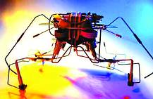 在模仿登陆火星的试验中,一辆漫游车携带的机器蜘蛛临时替代出故障的无线电设备将信息传送回总部。这个大出风头的机器蜘蛛,便是美国宇航局喷气推进实验室设计的昆虫式机器人,它拥有异常灵活的腿,能跨越障碍,攀登岩石,探访其他靠轮子滚动前进的机器人无法抵达的区域。