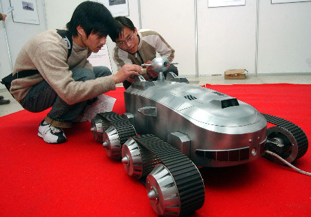 “21世纪航空航天与与机器人博览会”2003年3月15日起至4月6日在浙江图书馆举行,我国自主研制的月球车、能够检查核电站的蠕动机器虫、可以躲避鱼雷但能进攻舰艇的鱼型机器人等一批高端产品。图为展示中的一个转臂式八轮月球探测移动机器人。
