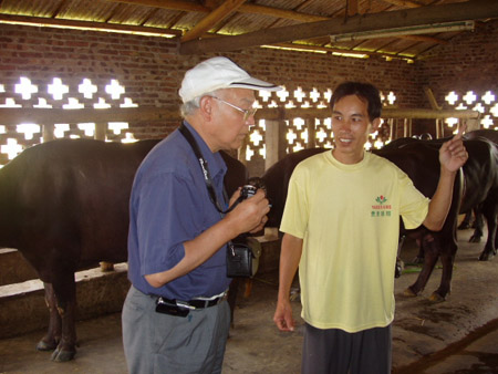 张新时在广西北流市民乐镇镇中灵村与养牛户凌开旬交谈 7月6-12日,中国科学院学部“三农问题”重大咨询专题关于“奶水牛问题”咨询专家组,在张新时院士带领下,对广西、广东两地进行了实地考察。