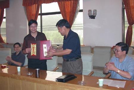 两地县委分别召开了隆重的欢送座谈会,县委、政府、人大、政协四家班子领导和有关部门负责人在座谈会上对水生所派出的科技副职做出的成绩给予了充分肯定和高度评价。水生所科技副职充分发挥个人专业特长和依靠水生所乃至整个科学院技术优势,努力为地方政府决策出谋献策和办实事,在发展地方水产养殖业和水环境资源保护与利用方面做出突出贡献,两位科技副职还在当地光荣地加入了中国共产党。蔡明艳同志在今年防“非典”中任淇县“非典”防治领导小组副组长及领导小组办公室主任,他不顾个人安危,身先士卒,忘我工作,始终战斗在防“非典”工作第一线,连续3个多月没回过一次家,为淇县打赢“非典”防治战役做出了重要贡献,为此,县委、县人民政府给蔡明艳同志记三等功一次。离任之际县委、县人民政府还决定聘任蔡明艳同志为县委、县政府科技顾问。