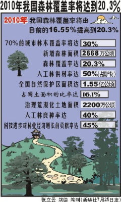 本报北京7月25日讯记者彭俊报道:2010年,我国森林覆盖率将由目前的16.55%提高到20.3%,全国70%的城市林木覆盖率将达到30%。这是中国可持续发展林业战略研究的重要成果之一。
