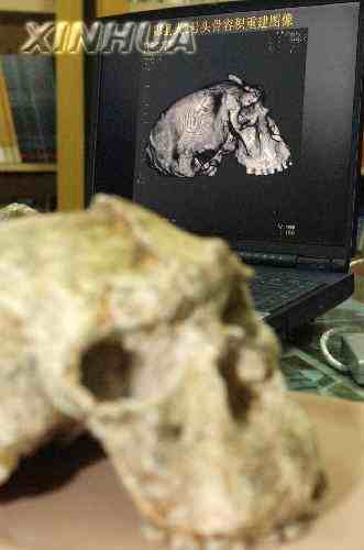 8月15日拍摄的湖北“郧县人”2号头骨复制品(前)的头骨容积重建图像(后)。 新华网武汉8月18日电(记者李鹏翔)经过一年多的努力,中、法两国的研究人员联合运用先进的计算机技术,对距今100多万年前的“郧县人”2号头骨进行了复原研究,测算出“郧县人”的脑量值为1065毫升,接近“北京人”的平均值1075毫升,这为“郧县人”可能处于比较原始的直立人阶段的推测提供了进一步的佐证。