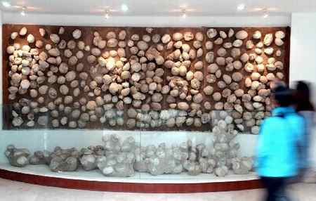 9月6日,参观者经过甘肃和政古动物化石博物馆内的陆龟化石壁。 中新社兰州九月六日电(记者殷春永)中国首座古脊椎动物化石博物馆今天在甘肃和政县正式对外开放。
