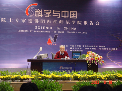 9月10日上午,何祚庥院士向省市教委领导、50余位中学校长、内江师范学院师生1200人作了题为“教育三个面向的反思”的专题报告,针对“经济实力与教育投入的关系”、“准确理解马克思主义关于生产力理论与教育的关系”、“正确理解历史唯物主义对科学教育的性质及其在社会活动中的重要性”三个方面的问题展开了演讲,特别是何祚庥院士提出“教育是第二生产力”的观点,并进行了论证,引起全场共鸣。