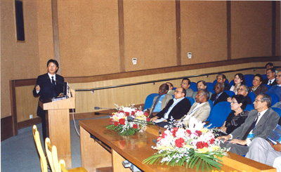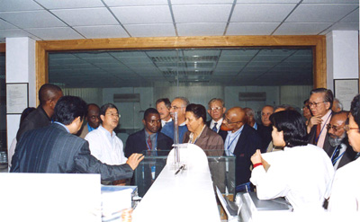 参观分析室 应全国人大常委会副委员长、中科院路甬祥院长的邀请,第三世界科学院第十四届院士大会暨建院二十周年纪念大会10月中旬于北京隆重召开以后,近半数参会代表于会后顺访了上海,其中包括第三世界科学院院长C.N.R.Rao、联合国教科文组织副总干事A. Badran、约旦高等教育与科研部长M.A.H. Ghanimah、巴西空间署主席L. Bevilacque、埃及科研与技术学院院长F.A.K.E. Rafaie、印度国家农科院院长V.L. Chpra、美国科学院院长B.M. Albets、古巴国民委员会委员F. C. Diaz-Balert 和越南科学与技术联盟主席H.V.tuyen等诸多要员。代表团由中科院陈竺副院长和郭华东副秘书长陪同来沪。