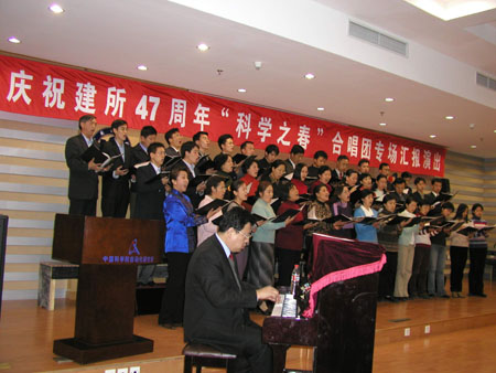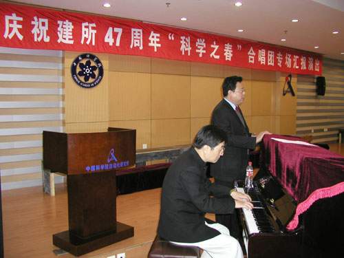 著名歌唱家、指挥家,国家一级演员朱成志老师正在伴奏,合唱成员们在倾情歌唱 自动化所庆祝建所47周年“科学之春”合唱团汇报演出于10月21日晚在自动化大厦报告厅举行。自动化所所长谭铁牛,党委书记、副所长张平,副所长乔均录,副所长谭民,所长助理赵红岩出席并观看了演出。演出还特别邀请了来自二炮文工团著名歌唱家、指挥家、国家一级演员熊亚光,武警文工团著名歌唱家、指挥家、国家一级演员朱成志作为嘉宾出席。当晚两位嘉宾分别为演出担任了指挥和伴奏。