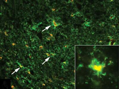 尽管小鼠的非神经元脑细胞中仍然含有朊蛋白(箭头指处和小图示),但小鼠脑组织中的海绵状病变却几乎完全正常了 新浪科技讯 美国东部时间10月30日(北京时间10月31日)消息,朊病(Prion diseases,即牛的“疯牛病”、羊的“羊痒病”、人的“克雅氏病”等病)被认为是死亡的前奏,因为目前还没有任何治疗手段,能够延缓或制止“疯牛病”、或与变体朊蛋白相关的其它疾病。英国伦敦医学研究会朊研究室约翰-科林和吉尔瓦尼-马卢西等在10月31日《科学》发表文章,报告他们设法使脑中仍有朊蛋白的、患朊病的小鼠的病程发生了逆转。该研究结果对朊病如何损害大脑的传统观点提出了挑战,并使日后治愈该病的前景豁然开朗。
