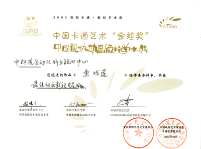 “2003年国际卡通·数码艺术周”是中华人民共和国文化部正式批准的中国唯一的国家级卡通盛典,由中国电视艺术家协会卡通艺术委员会、文化部中外文化交流中心等单位共同主办,旨为繁荣中国民族卡通艺术,用卡通的形式传播先进文化,推动数码技术与卡通艺术的更好的结合,打造中国卡通产业链。评定并颁布中国动画业的最高奖即“中国卡通艺术金蛙奖”和“中国视协动画短片学术奖”是本届艺术周的首要内容。数字动画短片《鱼戏莲》由中国科学院自动化研究所互联网研究发展中心科学艺术工作室制作并选送,作品被评为“最佳动画影视片花奖”突出显示了科学技术与艺术创作的完美结合以及交相辉映的创新魅力。