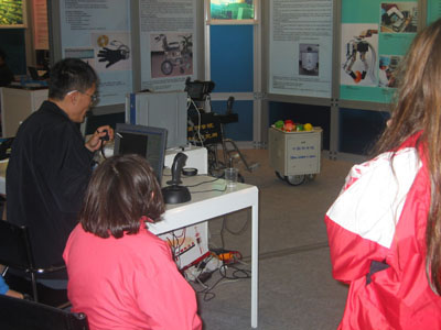自动化所参展的三项科研成果是在国家“863”计划、国家自然科学基金和所创新基金重大专项支持下完成的。展会期间,由于我们的三个参展项目所特有的互动性和参与性,吸引了众多的参观者,来自欧洲各国的参观者对中国科技的发展赞不绝口,并对自动化所的三项成果表现出了浓厚的兴趣。他们普遍认为数据手套作为一种重要的人机接口设备,在虚拟现实、手语识别、游戏开发和机器人遥操作等领域有着广泛的应用前景,但其中所使用的传感器是一个核心技术,在灵活性、柔韧性和可靠性等方面都有很高的要求。我们的数据手套采用了具有完全自主知识产权的弯曲传感器,它具有灵活、柔韧和可靠等特性,很适合在对角度进行连续和快速测量的场合(如:数据手套、数据衣等)中使用,因此,我们的数据手套在国内居领先水平,在国际上也处于先进水平,并且我们的数据手套具有更高的性能价格比和市场竞争力。对于智能轮椅和智能移动机器人,一些人普遍认为这些技术具有广泛的应用前景,在许多领域都需要相应类似的产品,比如一位在核电站工作的法国人认为我们这些技术可以应用于核材料的搬运、擦洗等,并向我们详细介绍了核材料的特性,最后表示如果有机会一定会和我们进行合作。