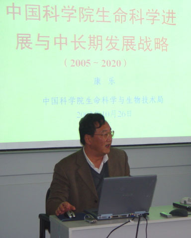 康乐局长在昆明做“中国科学院生命科学进展与中长期发展规划”报告 11月20日,院生物局康乐局长在昆明,为西南创新基地各所研究员及处级以上领导干部做了题为“中国科学院生命科学进展与中长期发展规划”报告。报告会由昆明分院张壮鑫院长主持。