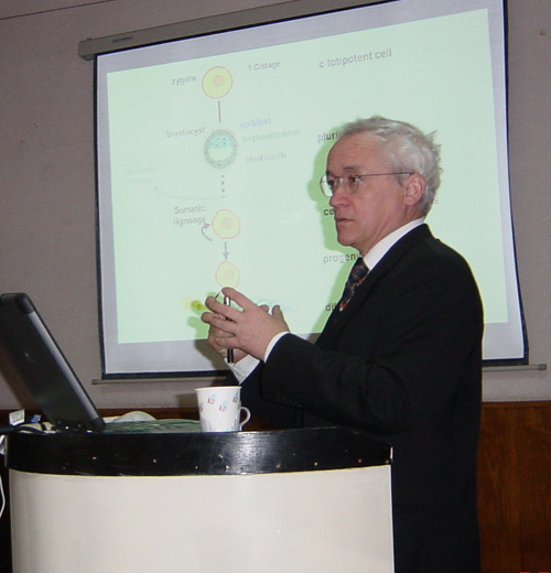 Renard教授还在动物所做了题为Nuclear Totipotency And Cellular Differentiation的学术报告。报告介绍了核移植的研究进展和存在的问题,对细胞核移植后的核质相互作用;组蛋白H1在核移植后的变化;核移植后染色质蛋白的交换和供体核DNA的甲基化状态等不同层次的影响因素进行了系统的介绍,报告持续了90分钟。