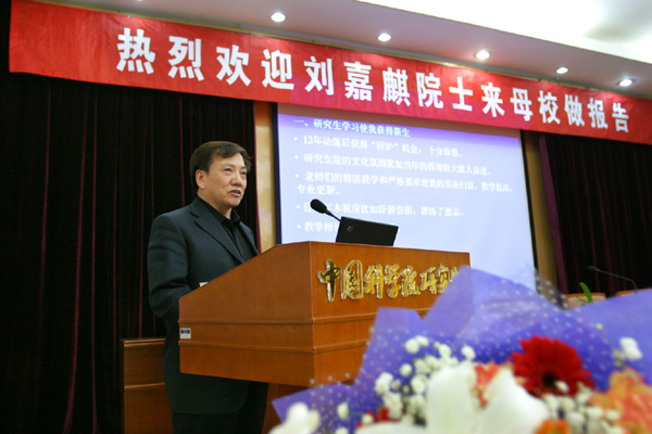刘嘉麒院士回母校研究生院发表演讲 2004年2月20日下午,刘嘉麒院士登上中国科学院研究生院建设与发展论坛的讲台,发表了题为“从学生到老师—在研究生院教育下成长”的演讲。研究生院部分教职员工和学生聆听了他的精彩演讲。